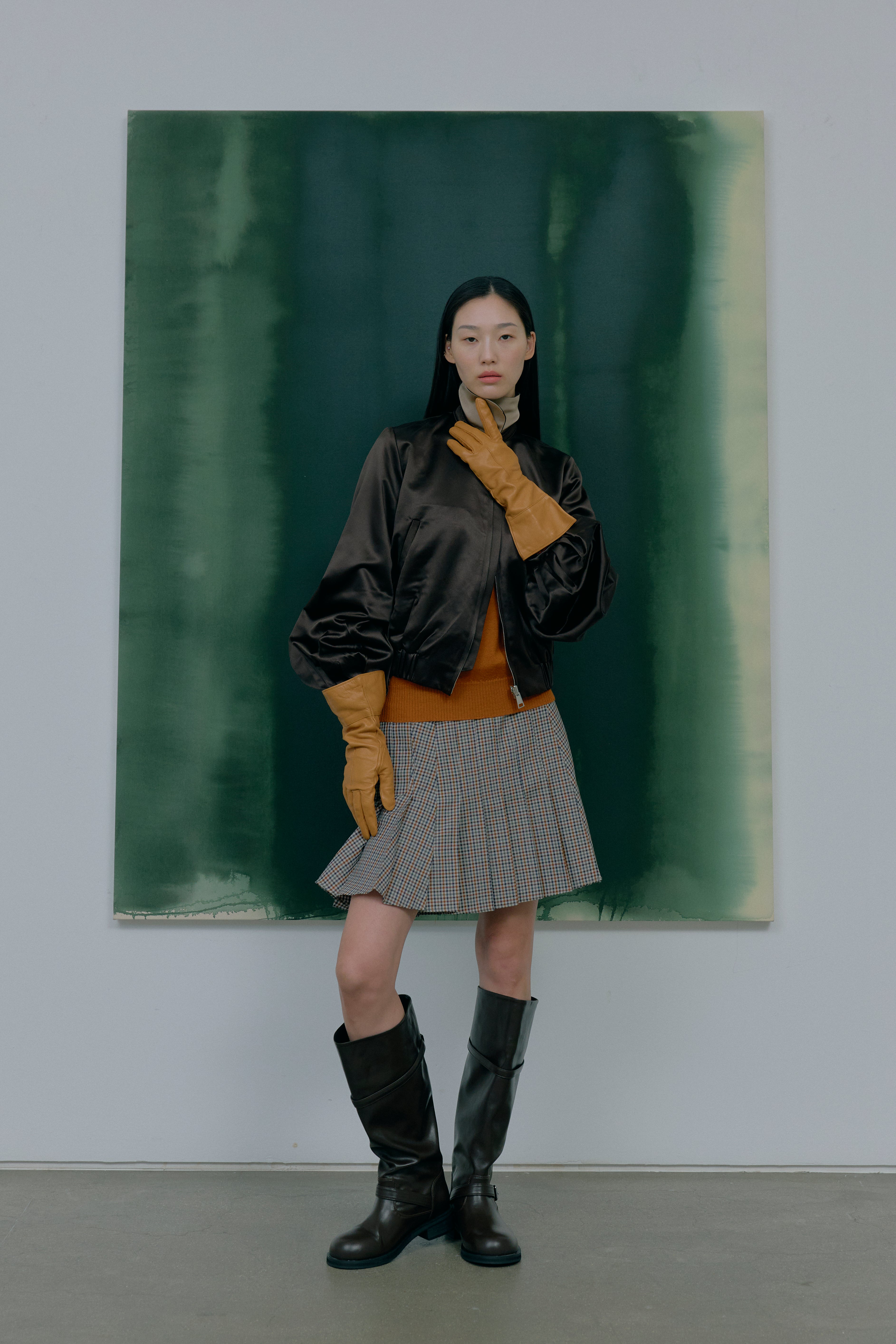 Bomber-style jacket crafted from pure silk duchesse in a rich chocolate shade. Designed with long sleeves without cuffs, finished with internal pleats that create a subtle balloon effect. The front features a double-slider reversible zipper and side welt pockets. The body is lined in copper and violet silk with distinctive frayed detailing, while a shirt collar with internal stand and contrasting hazelnut under-collar completes the design. The hem is finished with matching fabric and internal elastic.