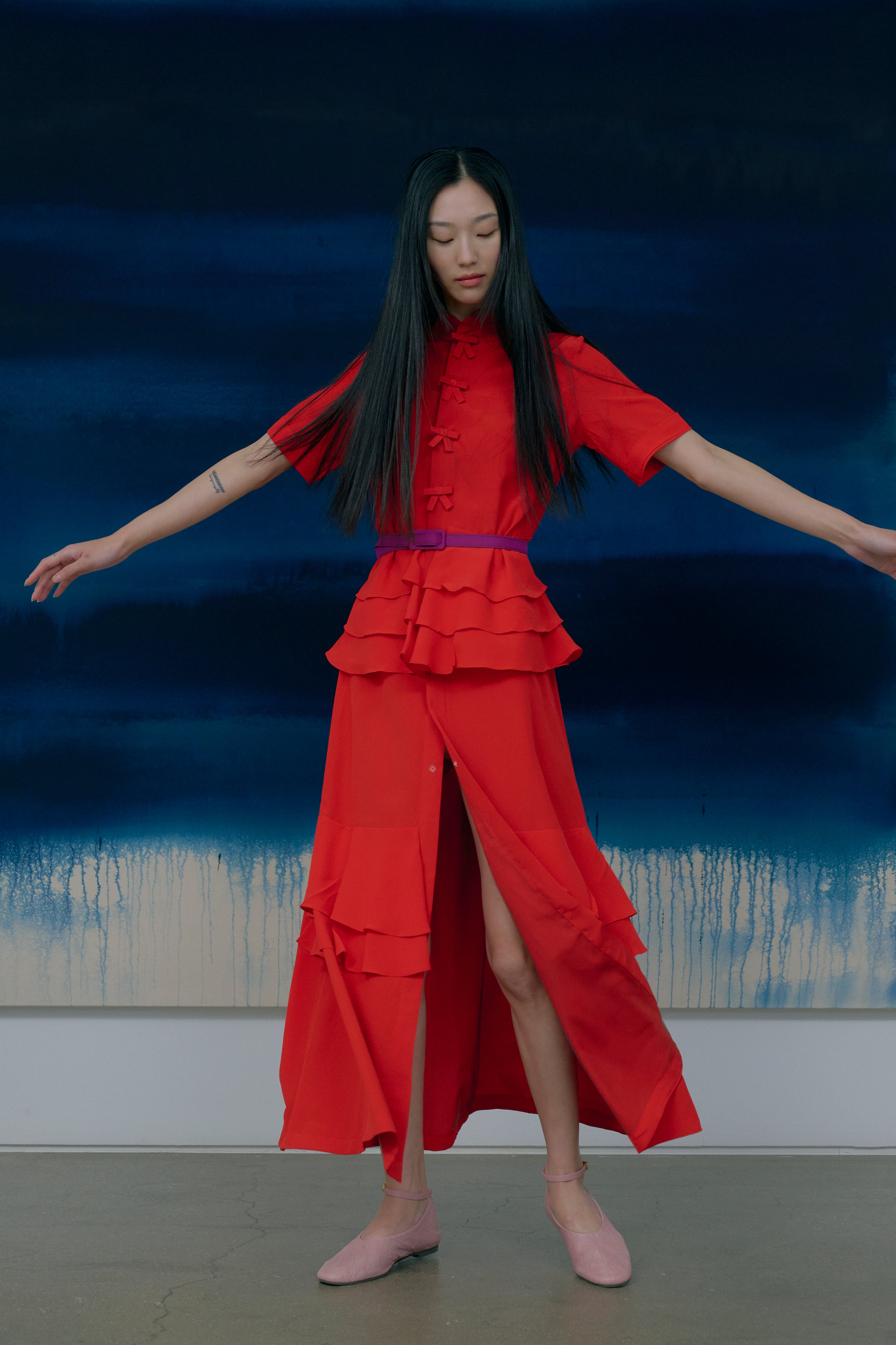 A red silk chemisier dress crafted from pure silk with a fluid, lightweight feel. It features a concealed front closure accented by small decorative bows, a flared skirt with layered ruffles, and a mandarin collar with short sleeves. A soft back pleat adds ease, while the maxi length silhouette is finished with a slim belt to define the waist.