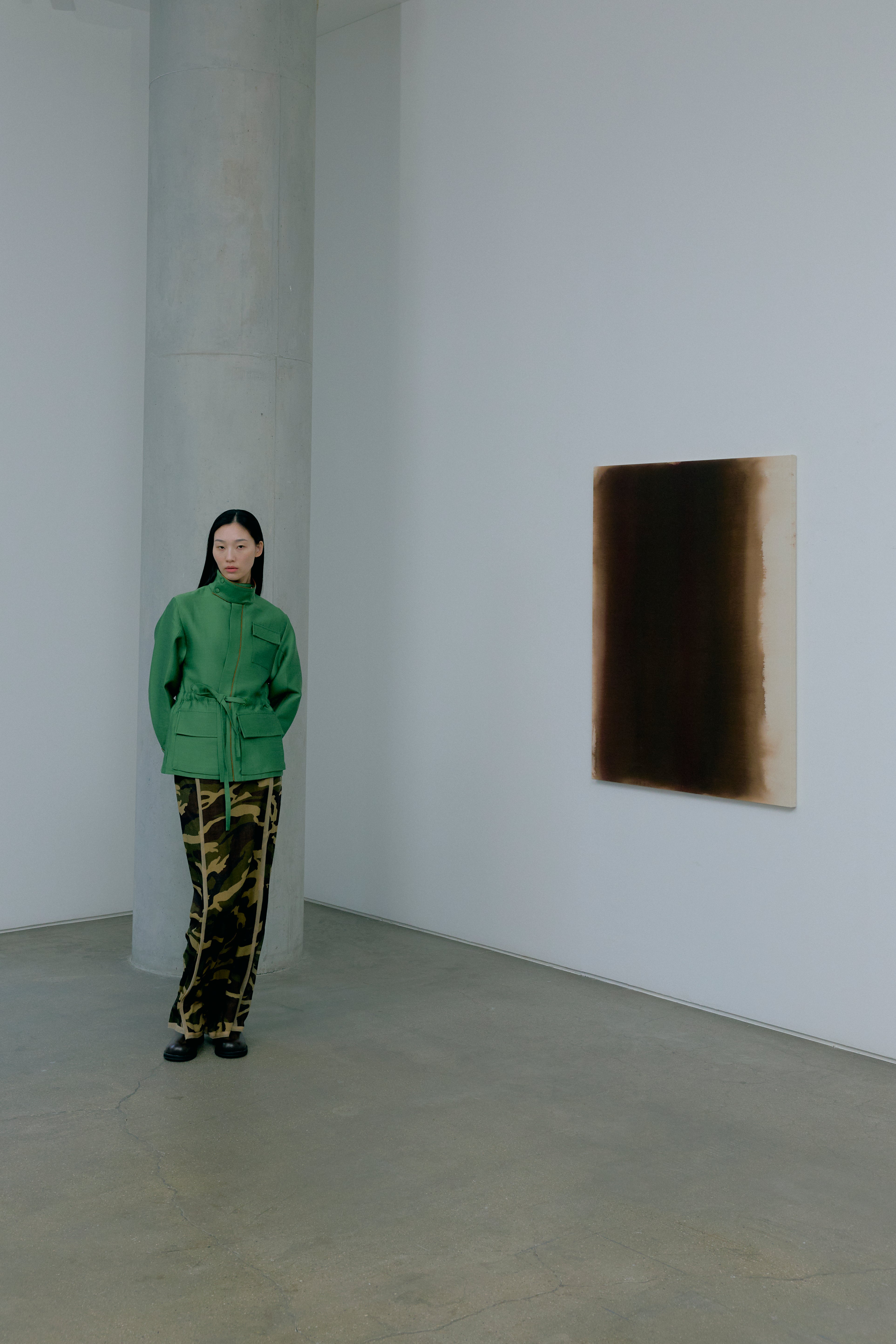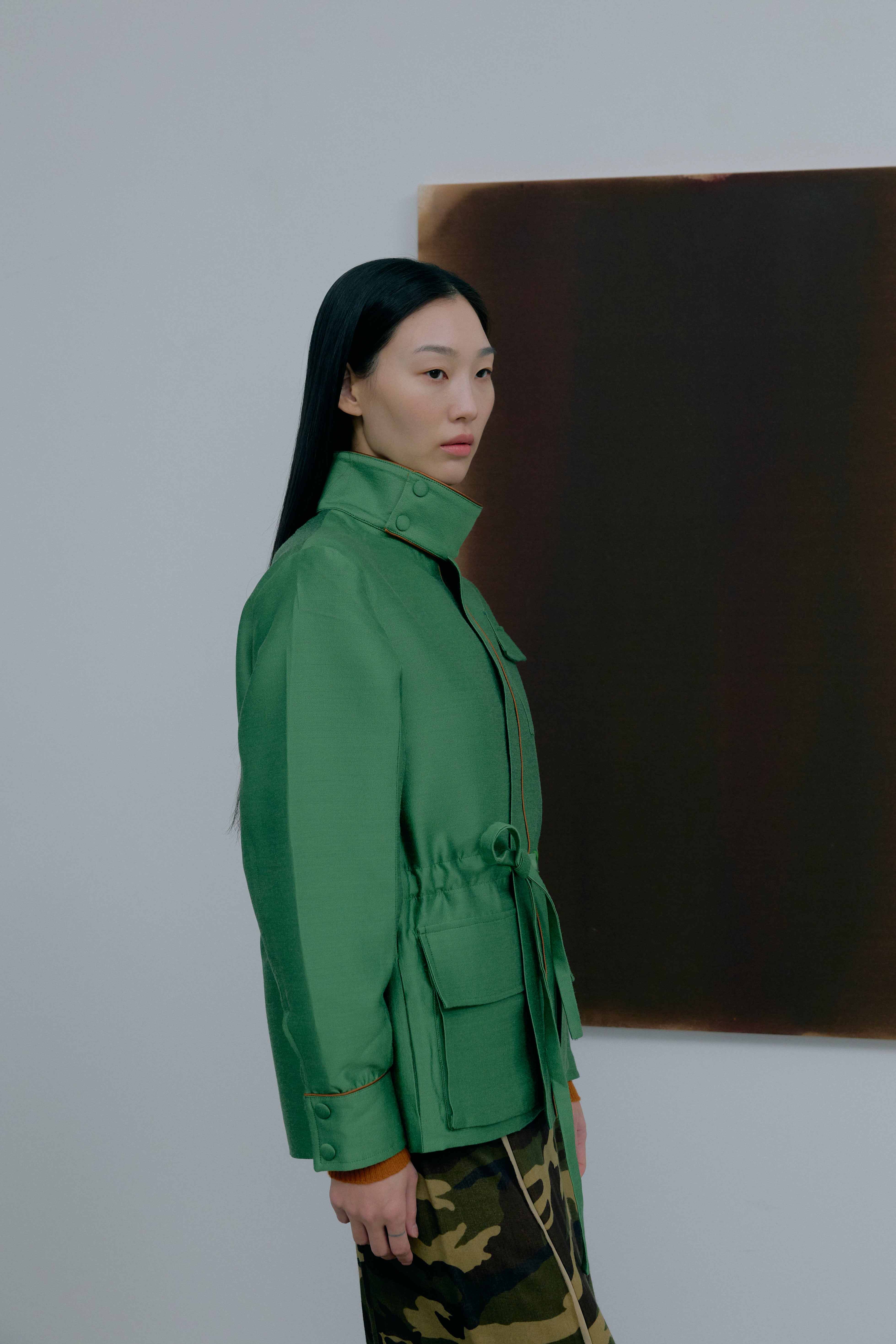 A chic, deconstructed parka crafted from luxurious wool and silk Mikado, designed to elevate any look. Unlined, with all internal seams finished in contrasting cobalt silk binding, while the sleeves are lined. It features a biker-style high collar with adjustable opening and fabric-covered snap buttons, contrasted by a pure wool inner collar in a warm pumpkin tone. Finished with matching snap-button cuffs and front facings detailed with contrasting pumpkin-colored piping.