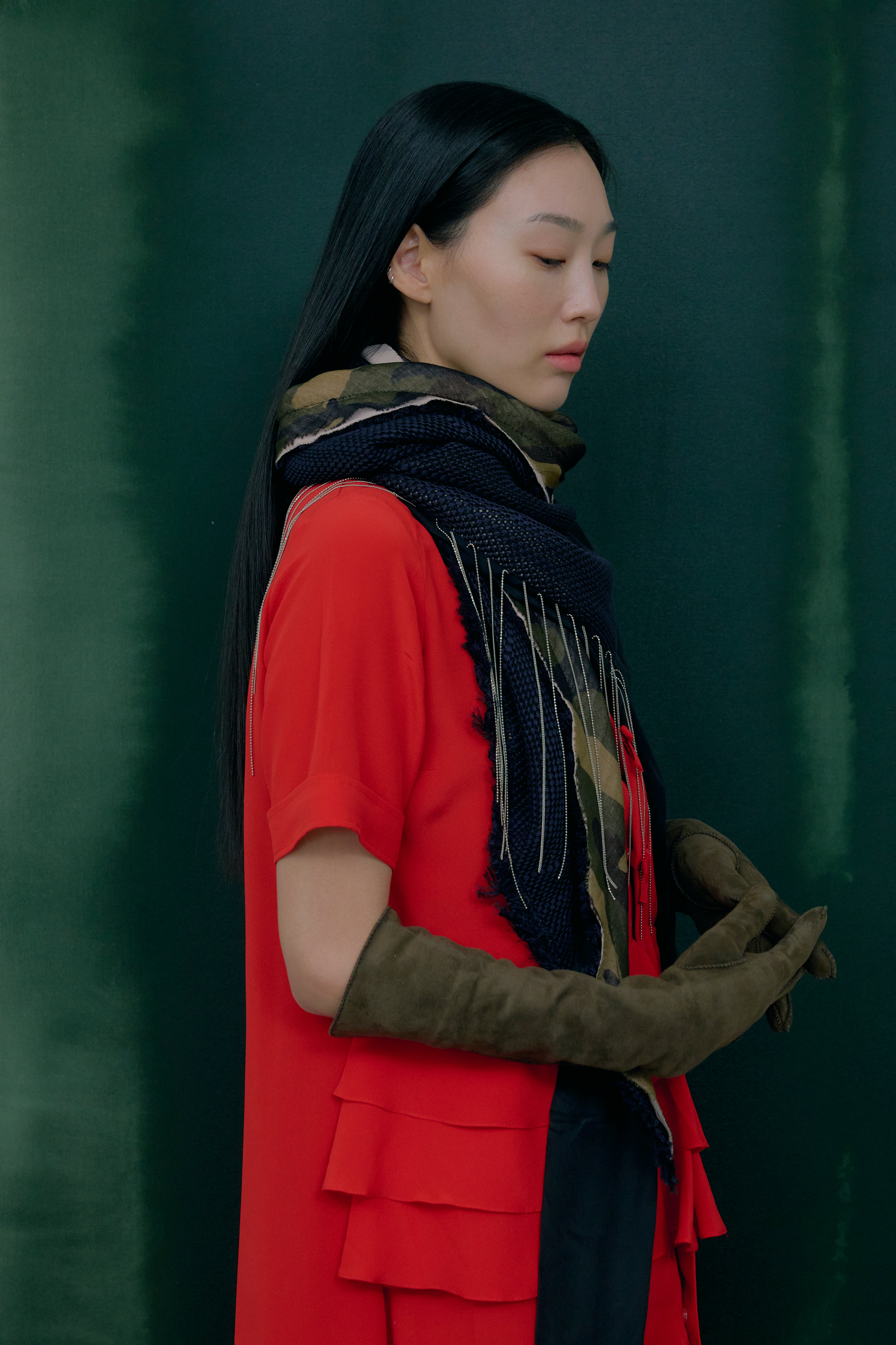 This triangular scarf is crafted from one of the most prized cotton fibers, woven in a wide-fiber jersey. It is double-layered with camouflage wool for a soft, lightweight drape that feels comfortable against the skin. Hand-applied silk bands and ribbons are finished with metallic, nickel-free fringe, safe for sensitive skin.