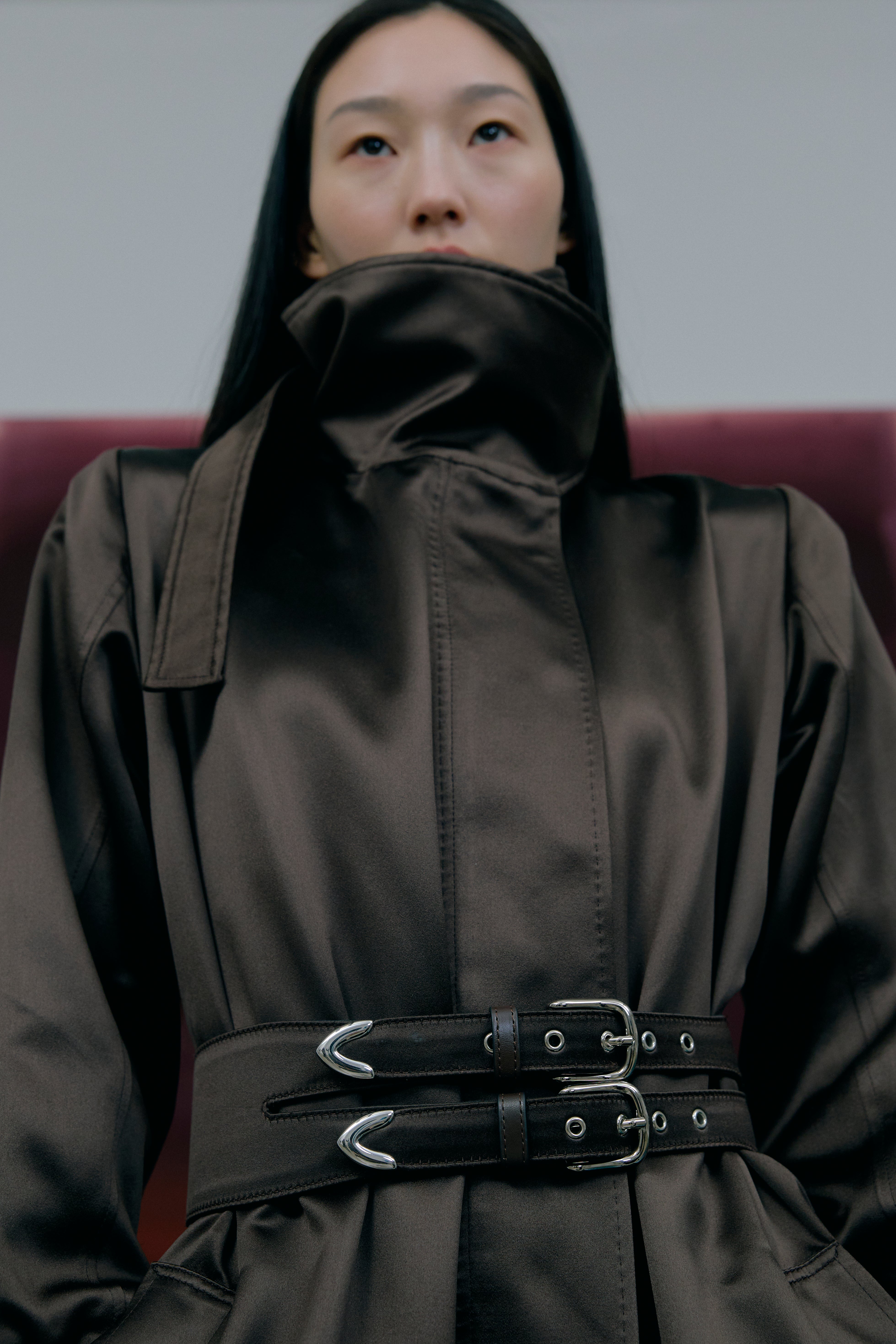 A statement coat crafted from silk duchesse in a rich chocolate shade. Designed with long sleeves featuring buttoned cuffs and slit detailing, it closes at the front with a double-slider reversible zipper. The neckline is finished with two ties that can be knotted or left loose, while a back yoke adds soft volume. Fully lined in pure cobalt silk pongé.
